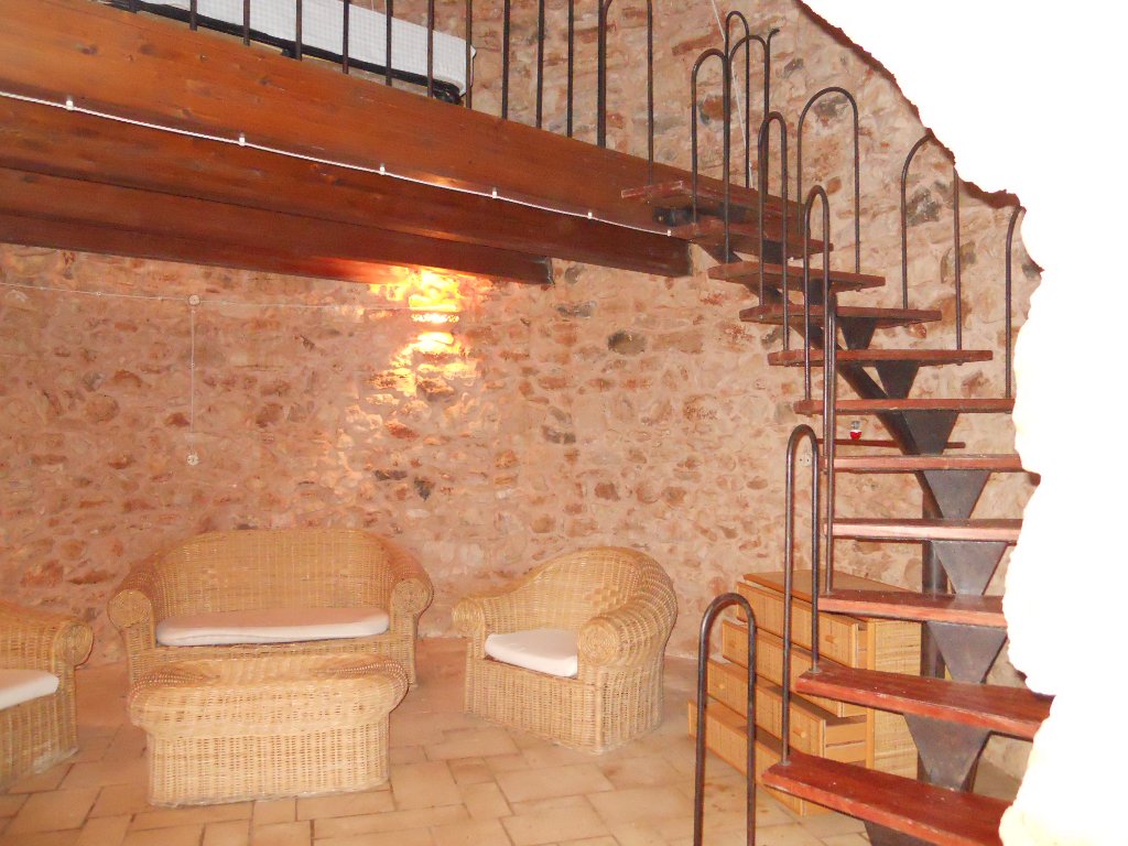 - rampa di scale che porta ad un soppalco in legno con letto matrimoniale;